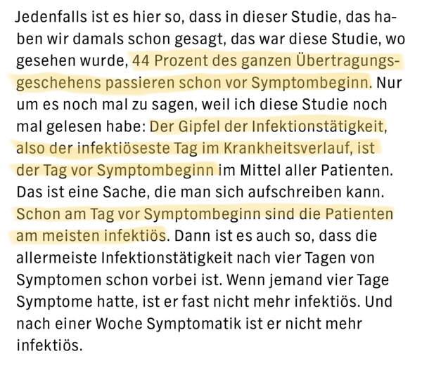 Und jetzt kommt meiner Meinung nach der Knackpunkt: 44% der Übertragungen finden vor Symptombeginn statt, man ist im Schnitt 2,5 Tage vor den Symptomen ansteckend, und der Tag mit den meisten Übertragungen ist der Tag VOR Symptombeginn (RKI-Steckbrief). Fast die Hälfte der Ansteckungen findet also statt, bevor der Träger überhaupt davon wissen kann, dass er infiziert ist.