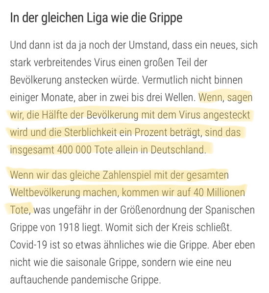 Zuerst muss man verstehen, dass Covid-19 nicht einfach eine „Erkältung“ ist, an der „nur“ sehr alte Menschen sterben. Auch die Aussage, dass es doch „nur eine neue Grippe“ sei, trifft nicht zu. Covid-19 hat das Potential, über 40 Millionen Tote weltweit zu verursachen.