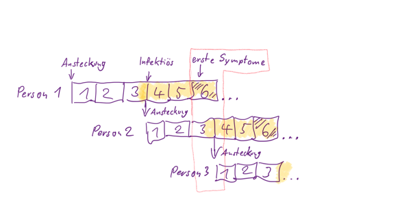 Mal ein konkretes Beispiel dazu: Wenn ich mich vielleicht in der Arbeit oder beim Einkaufen anstecke, dann stecke ich nach 3-4 Tagen meinen Sohn an, der dann wieder 3-4 Tage seine evtl. zur Risikogruppe gehörenden Großeltern ansteckt. Und erst zu diesem Zeitpunkt bekomme ich Symptome, aber dann ist es schon zu spät, weil die ganze Infektionskette bis zu diesem Zeitpunkt ohne Warnzeichen abgelaufen ist. Und weil mir das so wichtig zu verstehen erscheint, habe ich mal eine kleine Zeichnung gemacht: