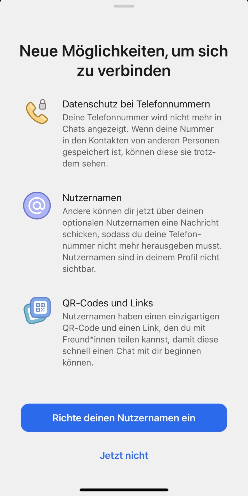 Na, das wurde aber mal Zeit. Bei Signal muss jetzt nicht mehr zwangsläufig seine Telefonnummer weitergeben, damit man kontaktiert werden kann. Es gibt jetzt nämlich Usernames :)